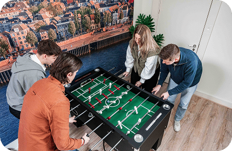 Naast dat harde werken is er ook ruimte voor plezier en gezelligheid. Of dit nou op een teamuitje is, tijdens een donderdagmiddagborrel of tijdens een iets wat fanatiek potje tafelvoetbal.